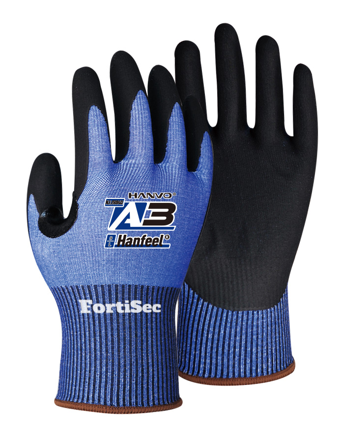 15-gauge HPPE/glass fiber liner featuring black micro foam nitrile palm-coated, reinforcement at the thumb crotch.
