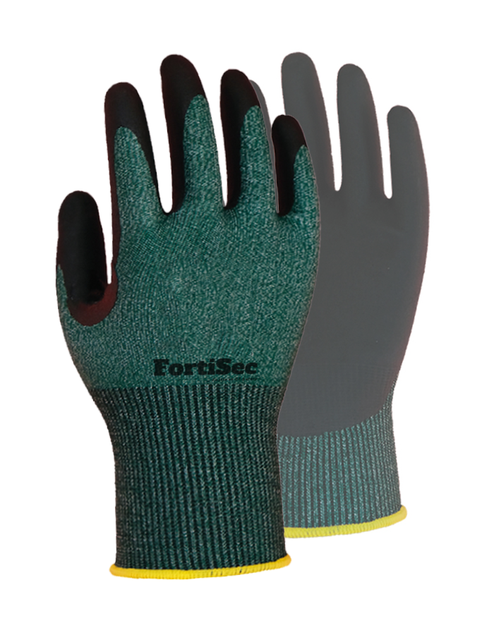 18-gauge green HPPE/steel/ spandex liner featuring black micro foam nitrile palm-coated.