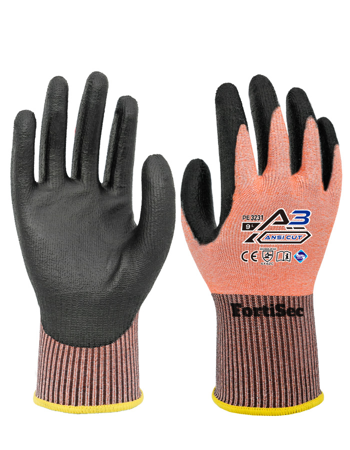 13-gauge HPPE/steel/orange polyester/spandex seamless knit liner featuring black PU palm coated.