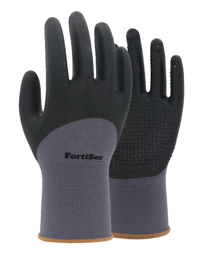 15-gauge grey nylon/spandex liner featuring unwashed 3/4 coverage black micro foam nitrile coating, dotted on palm.