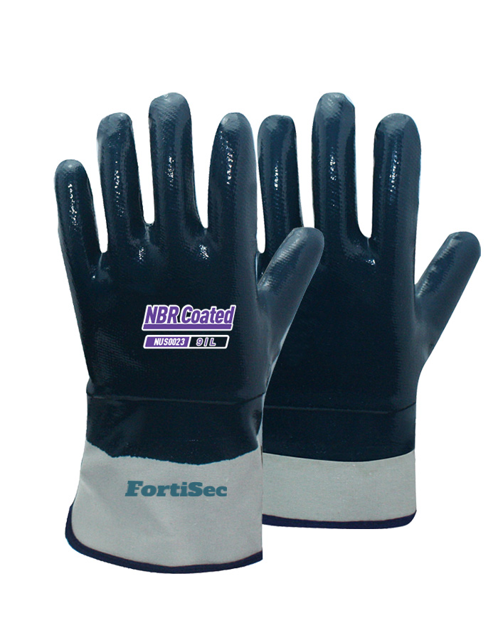 Cotton jersey liner safety cuff featuring full blue nitrile coating.